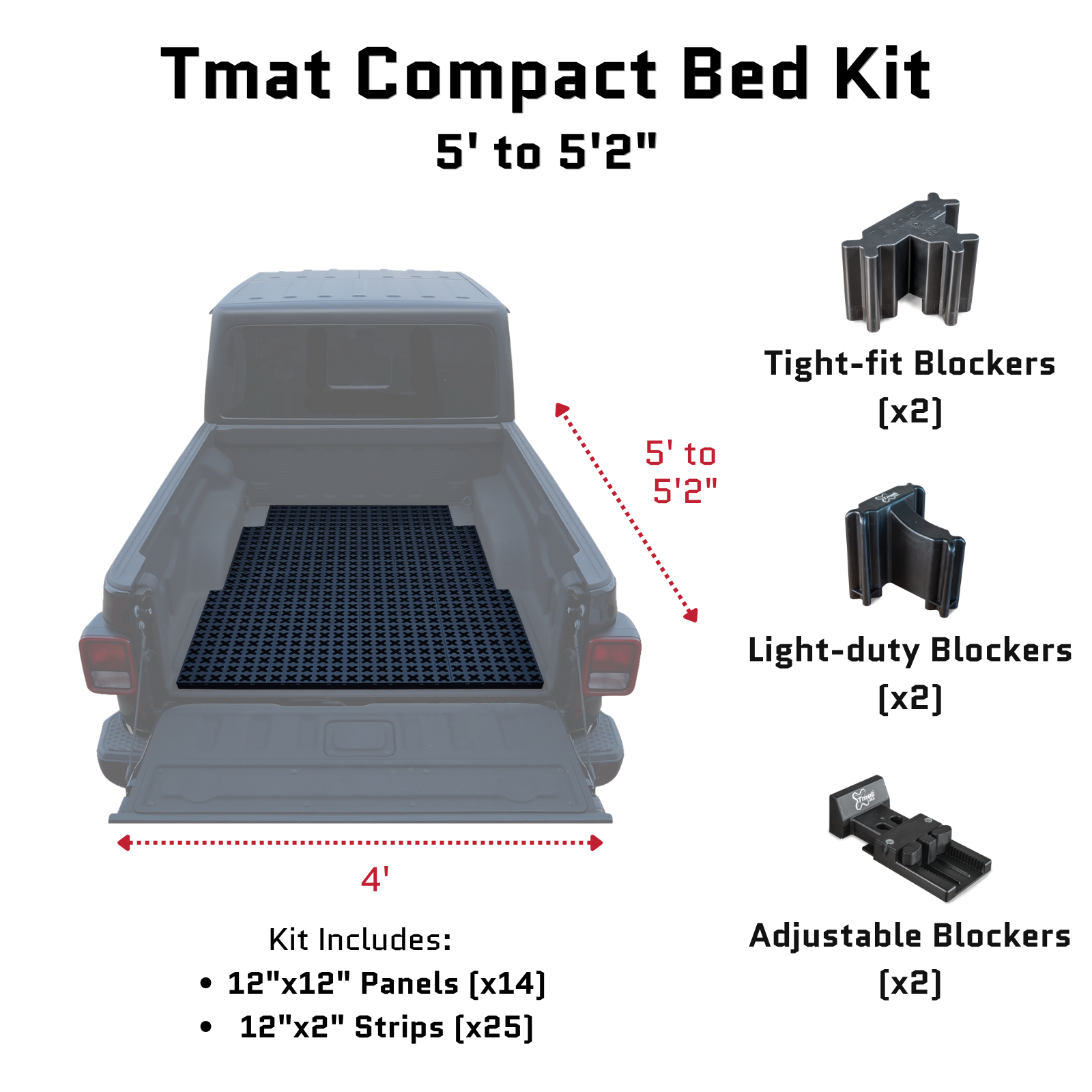 This kit fits between the wheel wells of most 4'6" to 4'11" compact truck beds. It includes enough Tmat strips to expand into the fender wells while still allowing slide out through the tailgate.