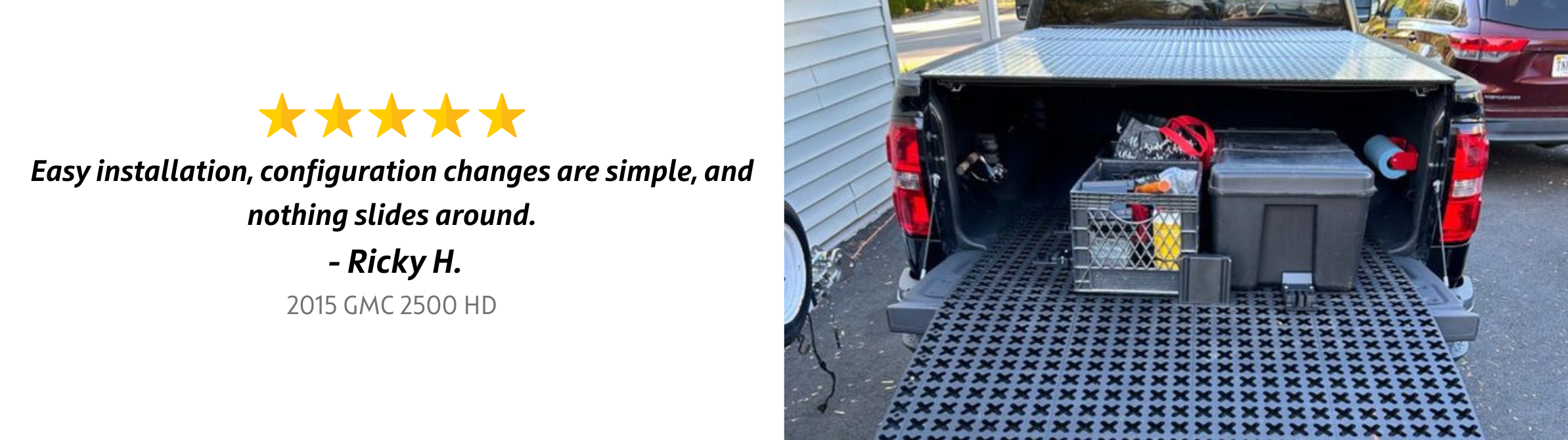Outfit your GMC Sierra 2500 HD with a cargo management system designed for advanced truck bed organization. Adjustable blockers plug into the mat in any arrangement, allowing you to create compartments for tools, gear, and equipment. The system fits between the wheel wells and slides out to the tailgate for quick access. Works with drawer systems, bed slides, and other custom setups.