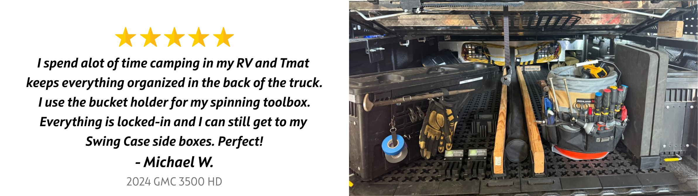WARNING: Tmat is designed for enclosed and covered cargo areas such as covered truck beds, SUVs, vans, campers, and enclosed trailers. Extra precautions must be taken when used in an open-air cargo area to protect from wind and roll-overs. Tmat should never be used in an open-sided bed or with the tailgate down.