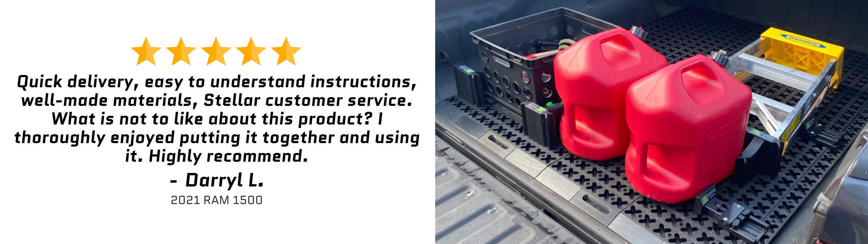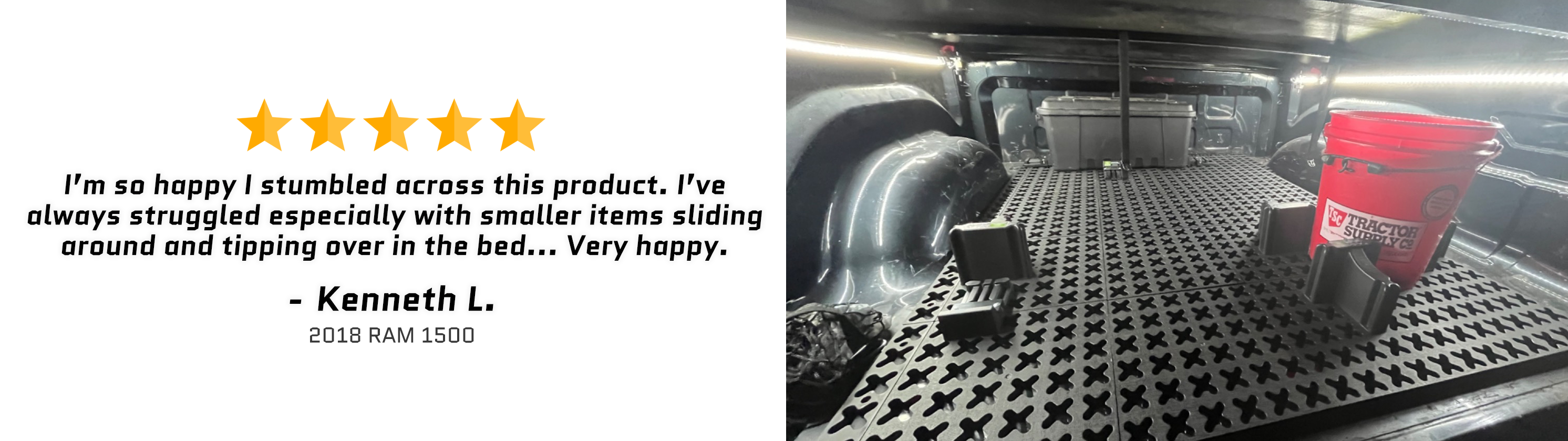 Organize your Ram 1500 with a cargo management system made for efficient truck bed organization. Adjustable blockers fit into the mat in any layout, creating compartments for tools, gear, and equipment. The system sits between the wheel wells and slides out to the tailgate for quick, easy access. Works with drawer systems, bed slides, and other custom setups.